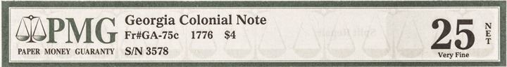 Colonial Currency. GA, 1776, $4, Liberty Cap Vignette. PMG Very Fine-25