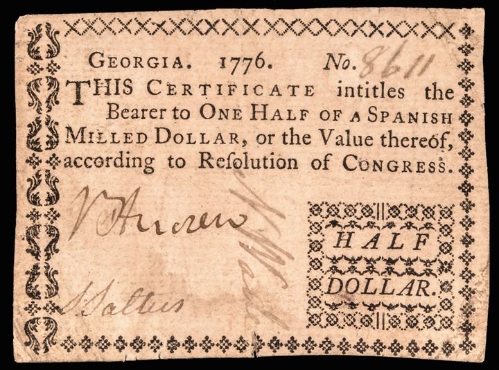 Fr. GA-70. A nice evenly circulated and well printed 1776 Revolutionary War smaller change note type. Border variety (c), Signed by Andrew, Saltus, and Wade. Noted on its holder, "Apparent small edge splits and tears” which refers to several tiny trivial edge wear splits at the bottom edge. This Georgia note is well centered with its full border designs present.