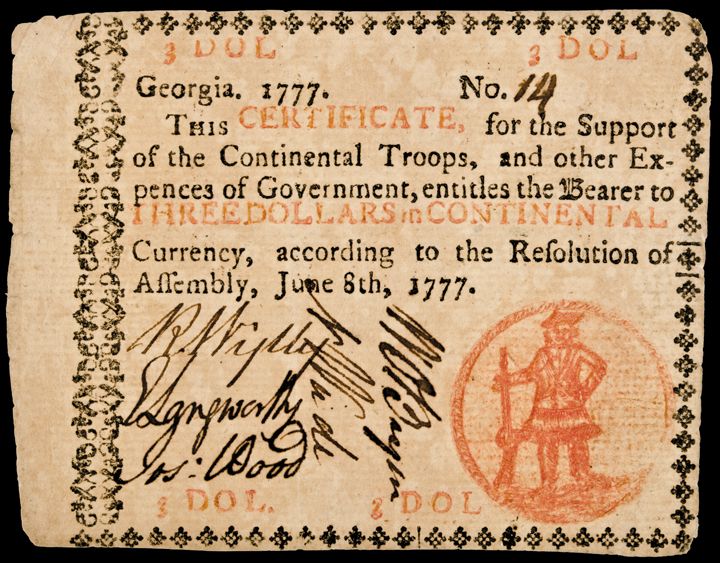 Georgia. June 8, 1777. Three Dollars. Red Seal. “Frontiersman” vignette. Red “in” Type. PMG graded Very Fine-30 Exceptional Paper Quality.