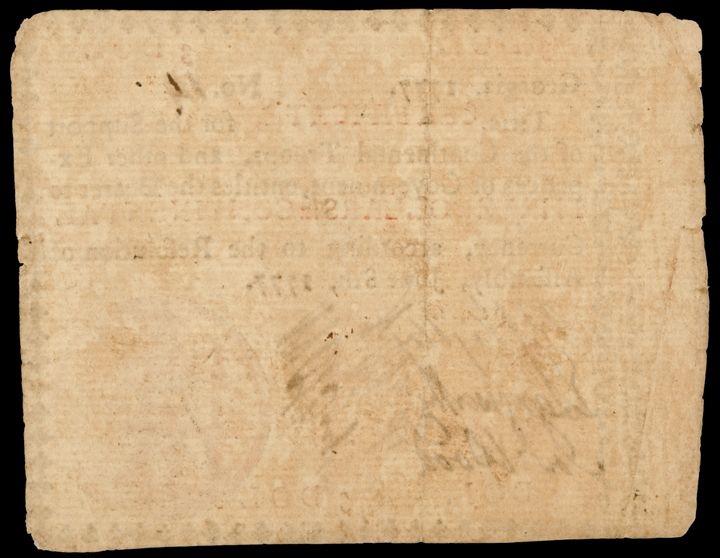 Fr. GA-105a. This colorful Revolutionary War issue Red and Black printed note is the Second Finest to be Certified by PMG with only one VF-35 note graded higher. Low serial number “14”. The solid period laid paper has nice even tone and very strong red and black text. With a huge left margin, all of the border designs are shown and the blank reverse is very clean. The signatures and serial number are written in deep brown including; Wylly, Langworthy, Wood, Wade and O’Bryen. This Revolutionary War period Georgia note very historically reads in part, “This Certificate, for the Support of the Continental Troops...”
