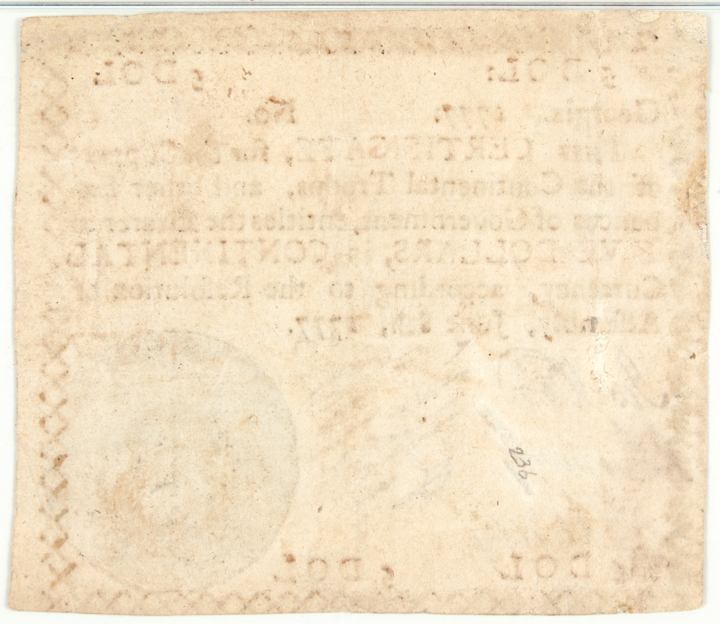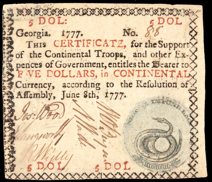 Colonial Currency, GA, 1777, $5, Rattlesnake