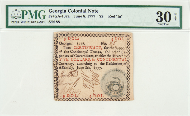 Georgia. June 8, 1777. Five Dollars. “Coiled Rattlesnake” Seal Vignette. Red “in” Type. Restoration. PMG Net graded Very Fine-30.