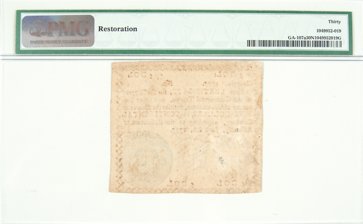 Fr. GA-107a. This is a beautiful and vivid note. This Revolutionary War issue bearing the printed text which reads “for the Support of the Continental Troops.” It is very bold in its red and black print with all five signatures present. This bold looking note has a truly wonderful “Coiled Rattlesnake” Seal, at the lower right. It is printed in colorful blue ink and is exceptionally sharp and clear,easily having the eye appeal of Extremely Fine. There is a trivial repair to the upper left corner tip as noted on its holder and it has the low Serial Number “88”. A wonderful looking Coiled Rattlesnake” Seal note.