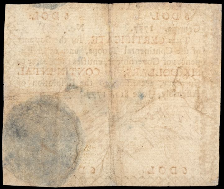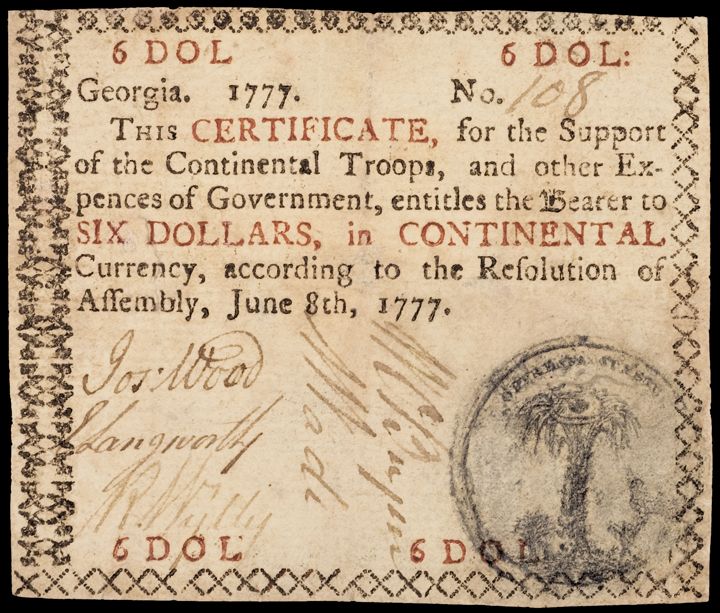 Colonial Currency, GA. June 8, 1777, Six Dollars Millstone on Palm Tree Seal