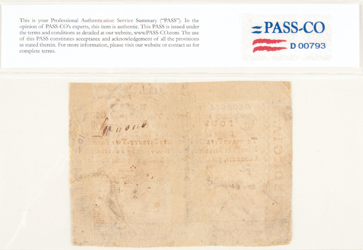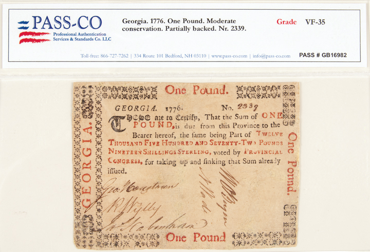 Province of Georgia. 1776 Sterling Denominations. One Pound. Moderate conservation. Partially backed. PASS-CO graded Very Fine-35.