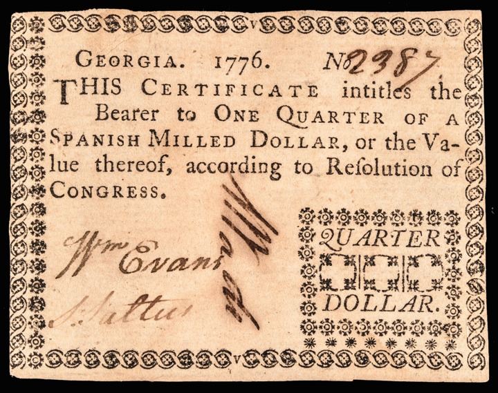 1776 Georgia Fractional Dollar Denomination $1/4 Note