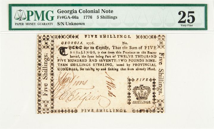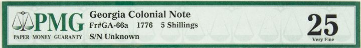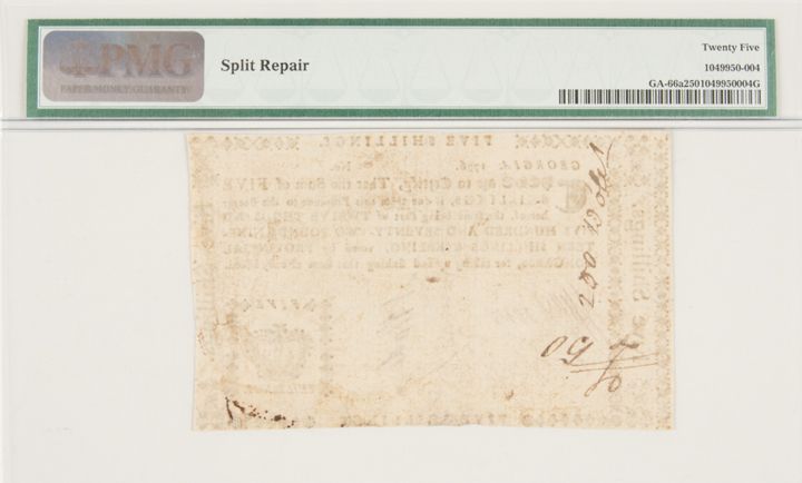 Georgia. 1776 Sterling Denominations. Five Shillings. “Crown” vignette. Split repair. PMG graded Very Fine-25.