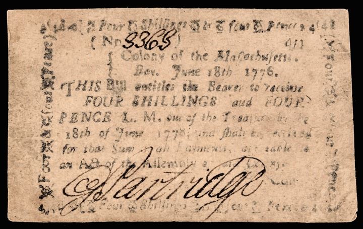 Colony of Massachusetts Bay. June 18, 1776. Four Shillings Four Pence. Due Date of June 18, 1778. PCGS graded Very Fine-25.