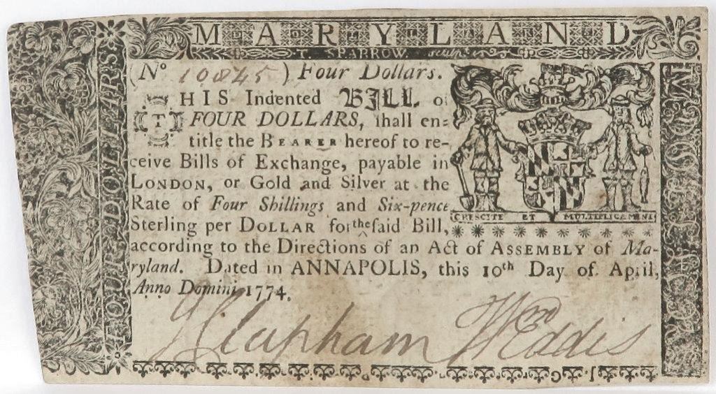 Colonial Currency: Maryland $4 Four Dollars Note April 10, 1774.