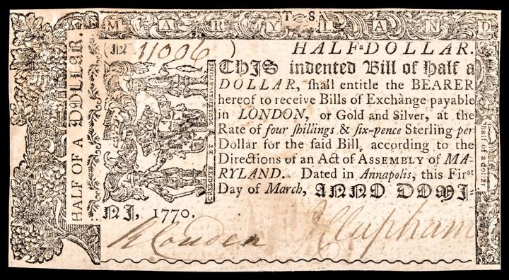Scarce March 1, 1770 Maryland Issue Half Dollar Note