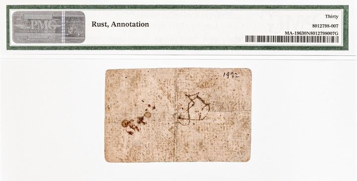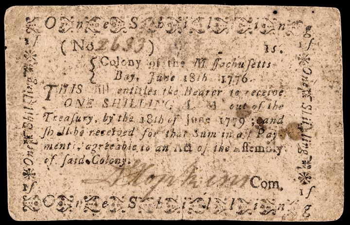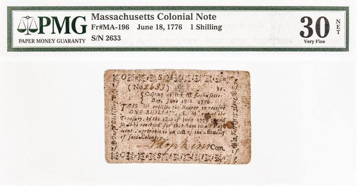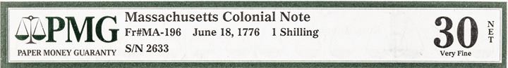 Colony of Massachusetts Bay. June 18, 1776. One Shilling. Due Date of June 18, 1779. PMG net graded Very Fine-30.
