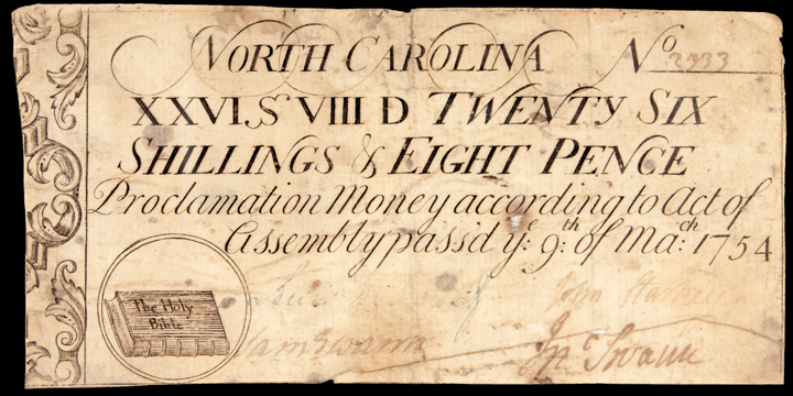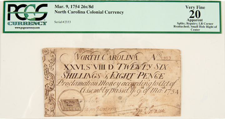 North Carolina. March 9, 1754 Act. Twenty-Six Shillings & Eight Pence. “The Holy Bible” vignette. Splits, Repairs, LR corner reattached, small hole right of center. PCGS graded Apparent Very Fine-20.