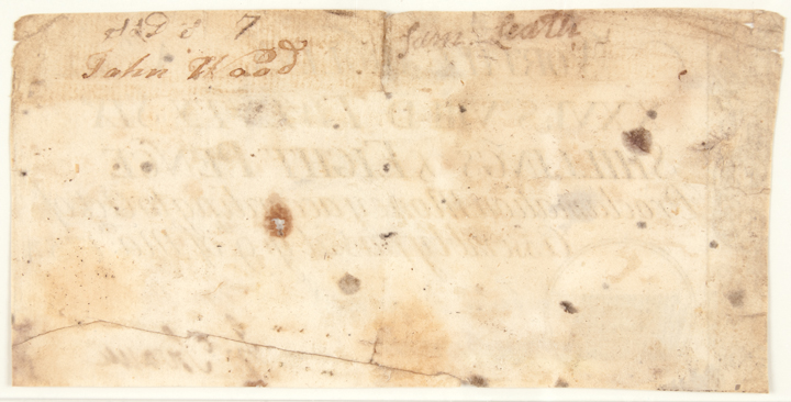Fr. NC-80. This note is Uniface, printed on laid paper with British Crown and Royal Arms watermark. Printed from engraved copper plates in black. Ornate indent at the left end, with text in block in script and leaning capitals, circle lower left with Bible vignette.
