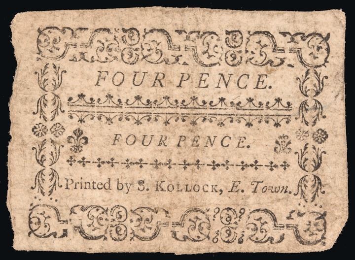 Fr. NJ-221. Wait 530. A rare denomination from this typeset issue, printed with the size smaller and typical period style, Printed by Kollock, see issue located in Newman, page 266, with illustration. Even in circulation having four full margins on both its face and reverse. Very rarely encountered and missing in most New Jersey currency collections.