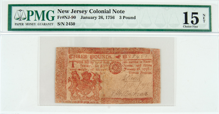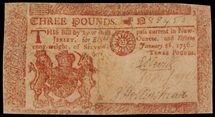 Colonial Currency, NJ, Jan. 26, 1756. 3 Pounds