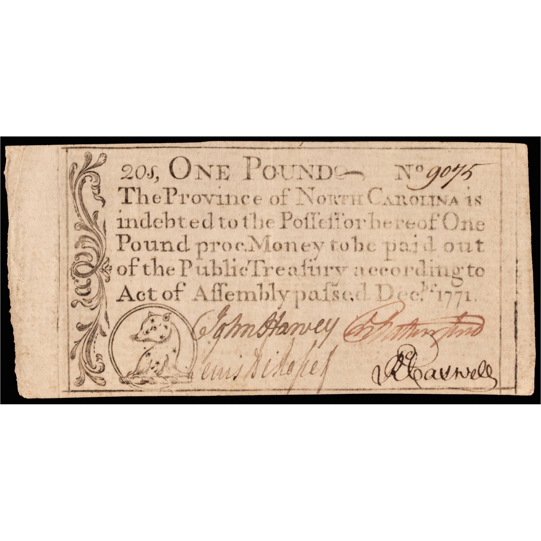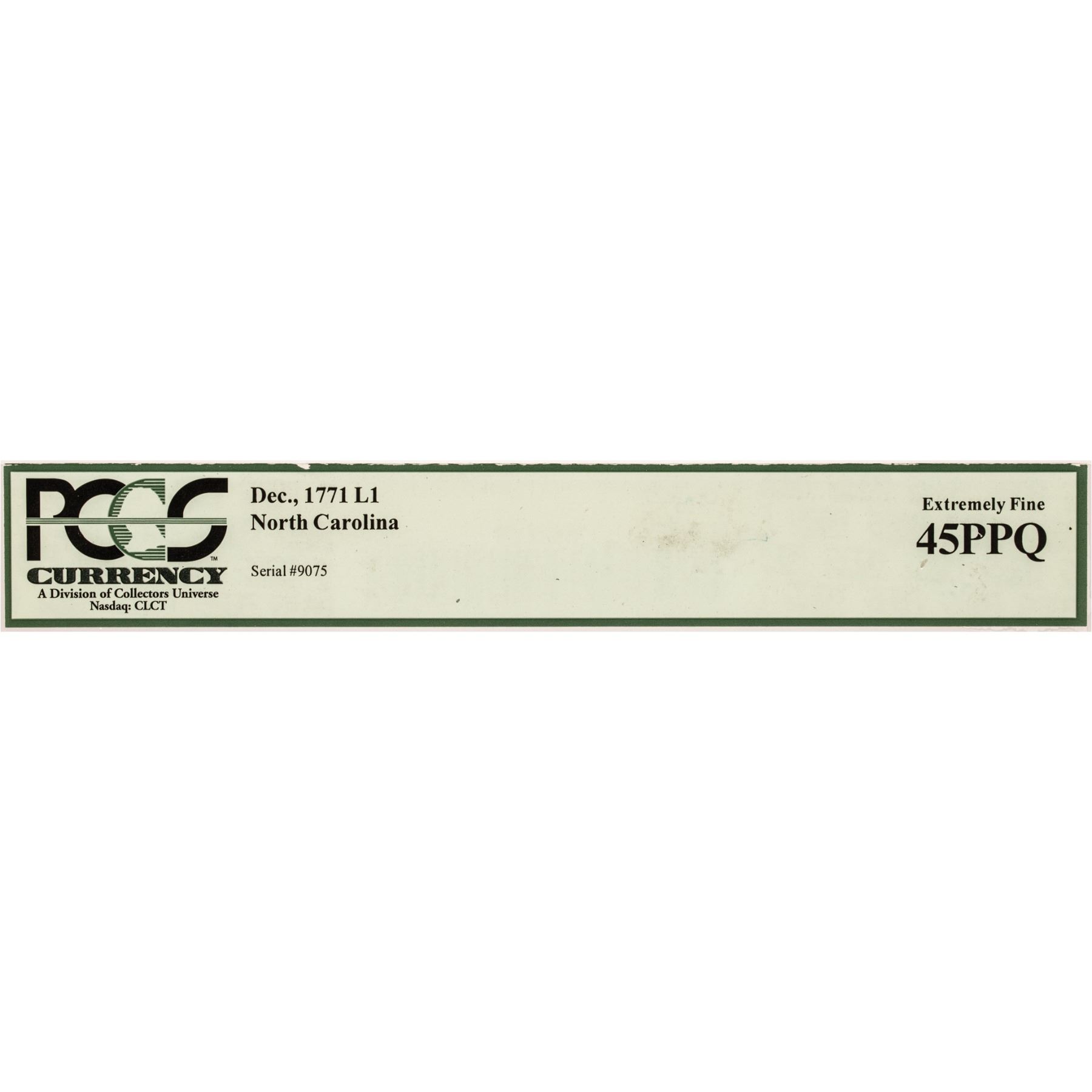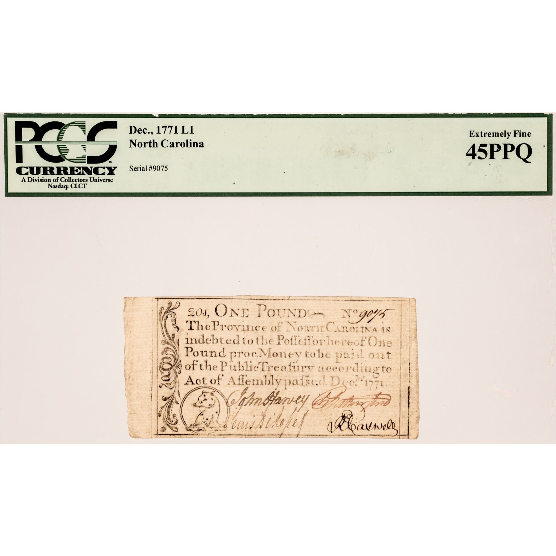 Province of North Carolina. December 1771. One Pound. “Bear” vignette. PCGS graded Extremely Fine-45 Premium Paper Quality.