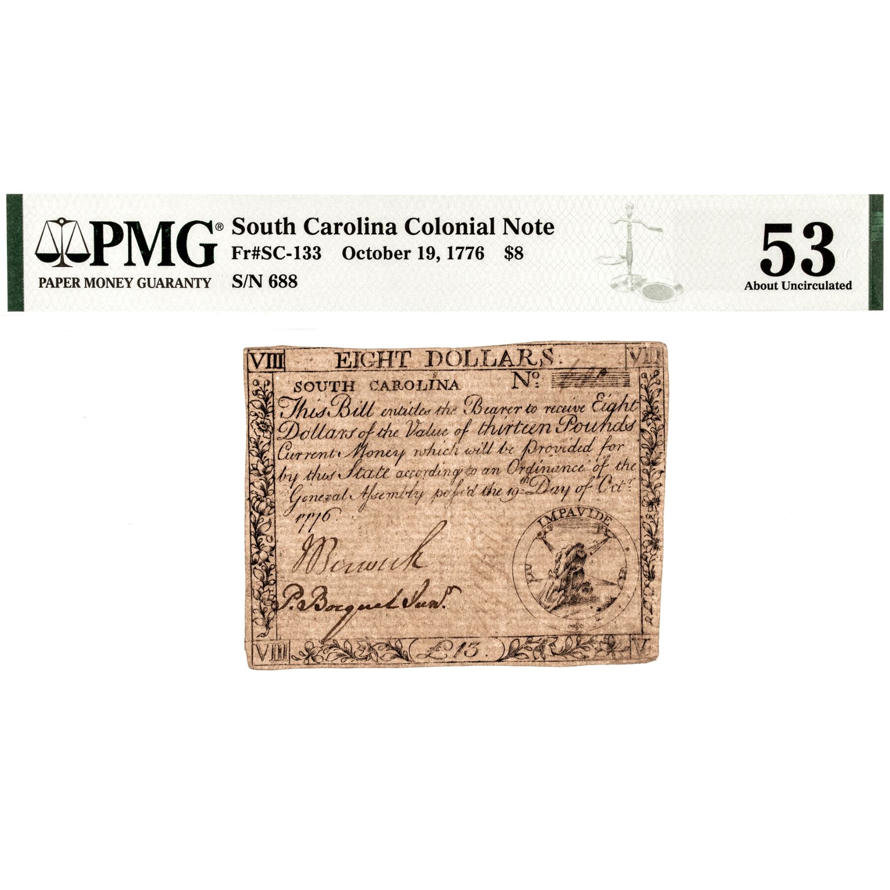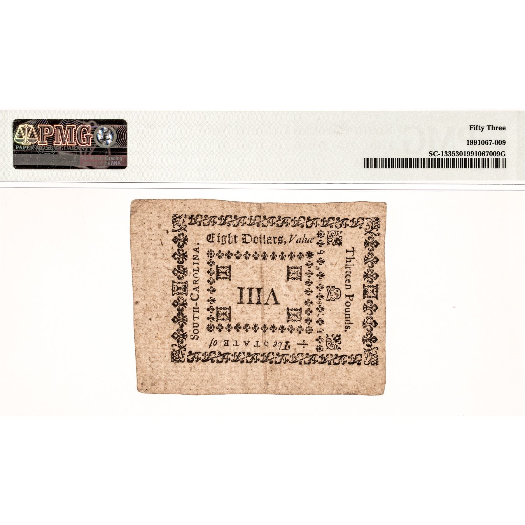 South Carolina, October 19, 1776, Eight Dollars, “Wind on Rock” vignette, PMG graded About Uncirculated-53.