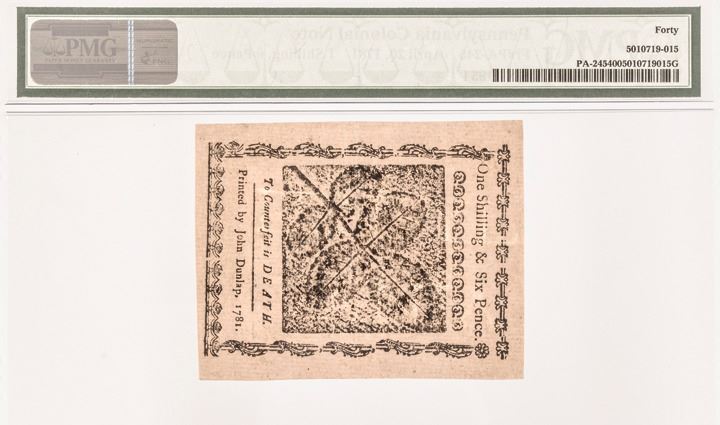 Fr. PA-245. This very impressive and rare Revolutionary War note has deep black printed text and designs within four full margins providing nice centering on both its face and back. This issue is “Printed by JOHN DUNLAP (famous printed of the historic Declaration of Independence Broadside version) 1781” and “To Counterfeit is DEATH” legends are vividly printed. The paper’s watermark reads “PENSYL-VANIA” being in large text design within the fresh bright clean period paper. This note appears conservatively graded, having the overall eye appeal near Crisp Uncirculated with just a couple faint folds seen on its reverse. A beautiful example and a scarce issue. The One Shilling Six Pence denomination is virtually impossible to locate so nice in quality.
