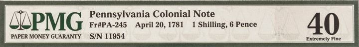 Commonwealth of Pennsylvania. April 20, 1781. One Shilling Six Pence. PMG graded Extremely Fine-40.