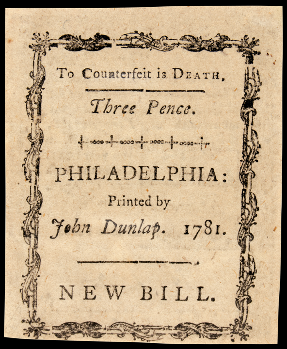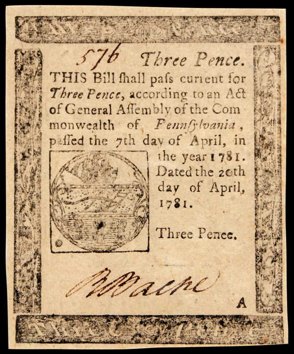April 20, 1781 Three Pence Pennsylvania Note With “Penee” Error and Boldly Signed By Richard Bache