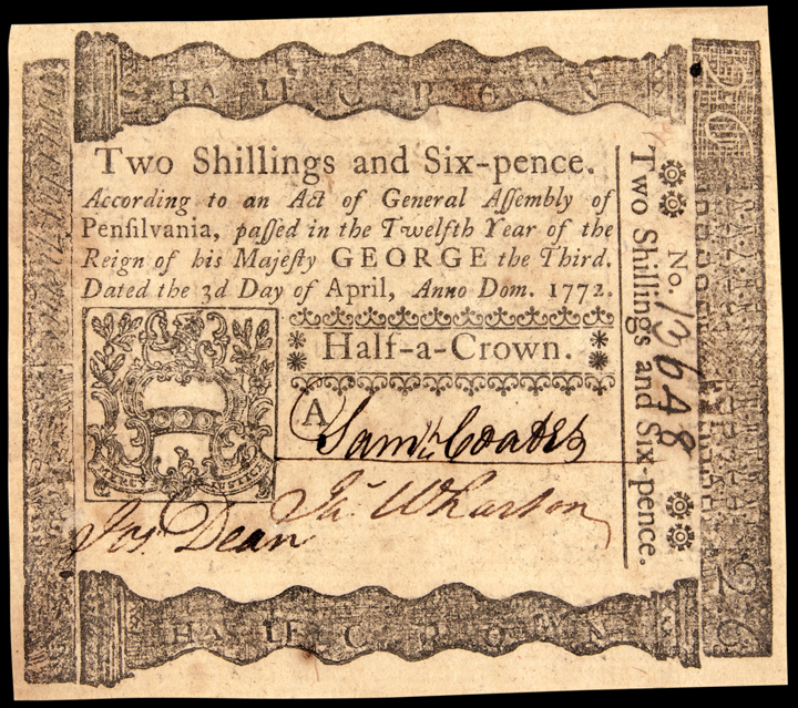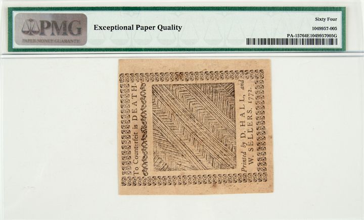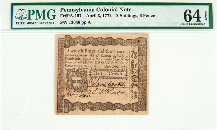Pennsylvania. April 3, 1772. Two Shillings Six Pence. Plate A. PMG graded Choice Uncirculated-64 Exceptional Paper Quality.