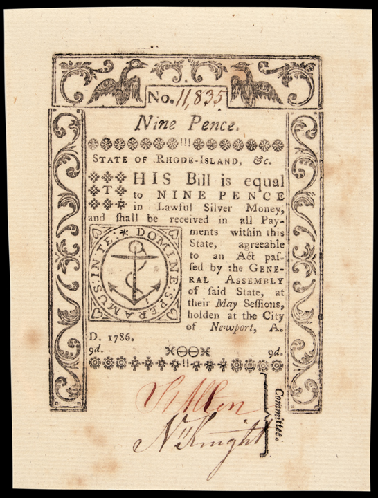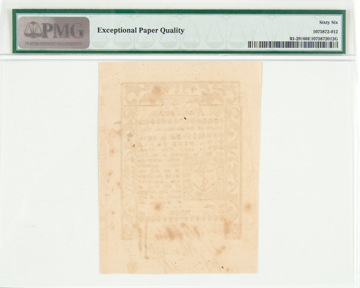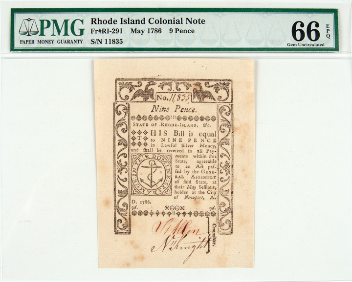 May 1786 Rhode Island Nine Pence Note Jumbo Margins PMG Gem Uncirculated-66 “Exceptional Paper Quality”