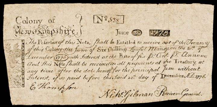 There are several typical deft sealed fold splits present. The signature of Nicholas Gilman as Receiver General for the Treasury, as well as E. Thompson, are well written in rich brown ink. This issue also carried a 6% Yearly Interest. Having a Due Date of December 20, 1776 it would have only had about six months to circulate, until it was to be turned back in to the Treasury for interest to be paid and the note itself then redeemed and destroyed.