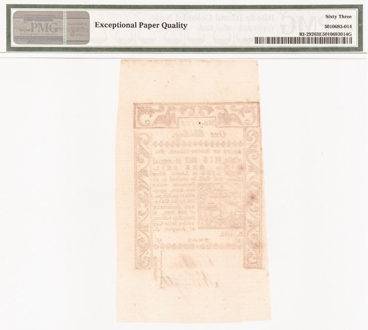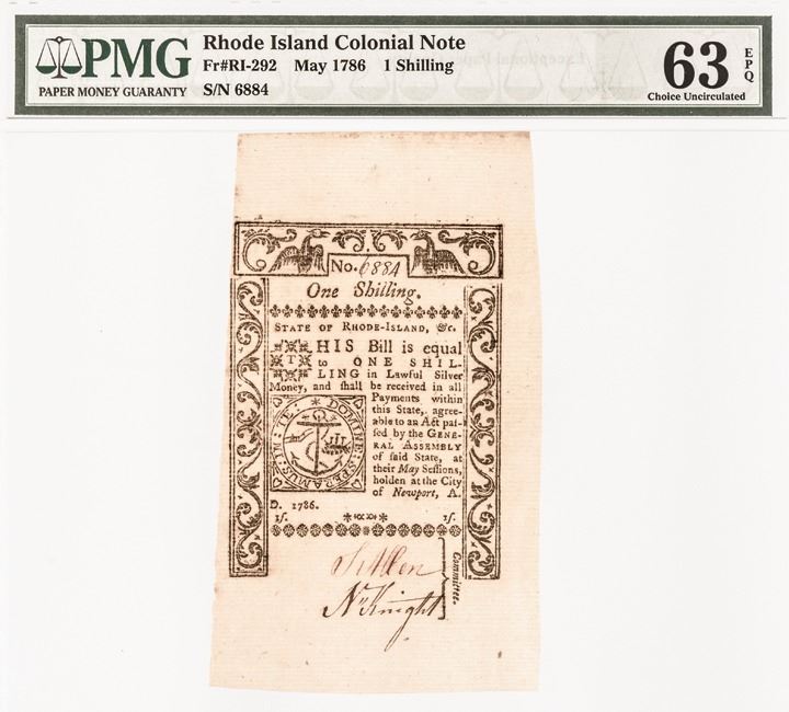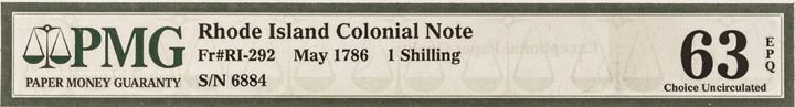 Colonial Currency, Rhode Island 1786 One Shilling PMG Choice Uncirculated-63 EPQ