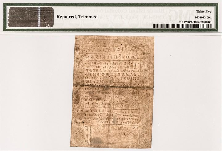 Fr. RI-178. A superior quality very early Revolutionary War note, issued less than one month after the historic April 19th, 1775 Battle of Lexington and Concord, PMG graded as Choice Very Fine-35 with repaired, trimmed noted on its holder. This cataloger finds the latter comment amusing as all Colonial Currency notes are trimmed, as made and cut from their original sheets. This note is quite nice having clear well printed text and designs within four full margins. Nicely signed in red ink at bottom by “Henry Ward” (1732-1797) served as Provincial Secretary of Rhode Island from 1761 to 1797, later becoming Rhode Island Secretary of State. A very nice note.
