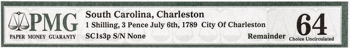 South Carolina. City of Charleston. July 6, 1789. One Shilling Three Pence. “Tobacco and Hemp Rope” vignette. “TREASUSY” Error Spelling. Remainder. PMG graded Choice Uncirculated-64.