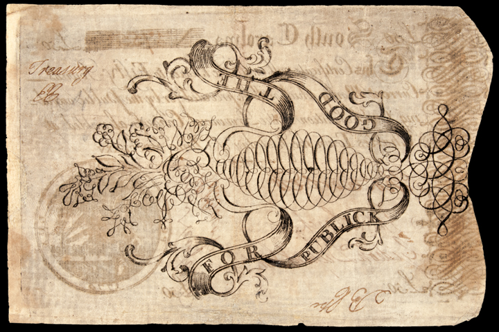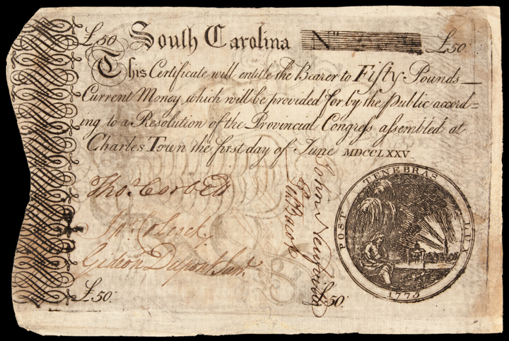 South Carolina. June 1, 1775. Fifty Pounds. “Woman Frightened by a Storm” vignette. Choice Very Fine to Extremely Fine.