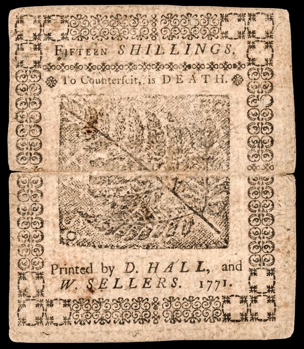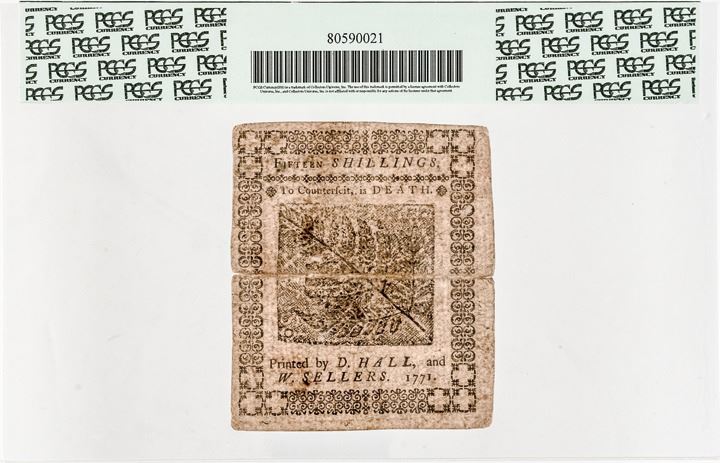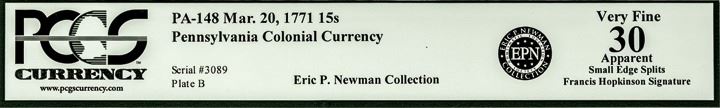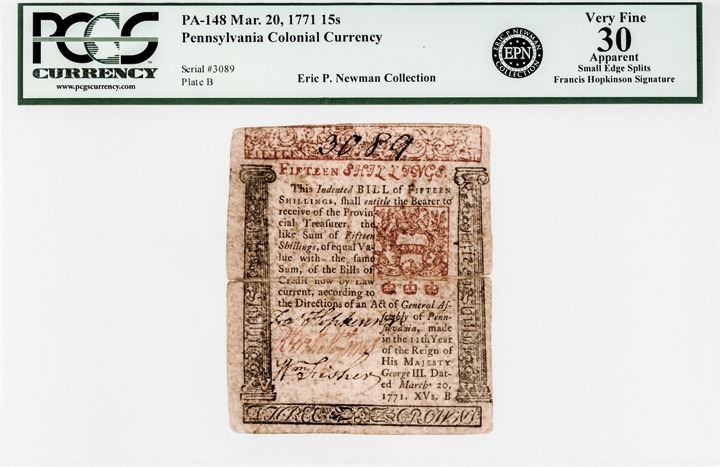 Fr. PA-148. Province of Pennsylvania. March 20, 1771. Fifteen Shillings. Plate B. Signed, “Fras. Hopkinson.” PCGS graded Very Fine-30. This note is well centered so as to fully display the Two-color red and black printed text and designs. Holder states apparent small edge splits, which are quite typical on a circulated note. All three signatures are present and readable with Francis Hopkinson signed in deep brown ink at top.