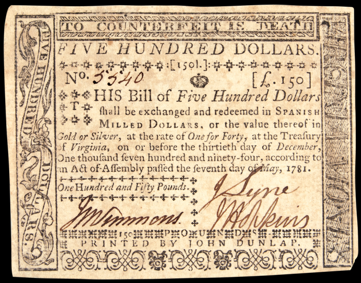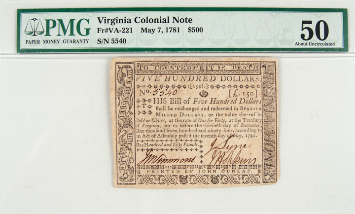 Treasury of Virginia. May 7, 1781. Five Hundred Dollars. PMG graded About Uncirculated-50.