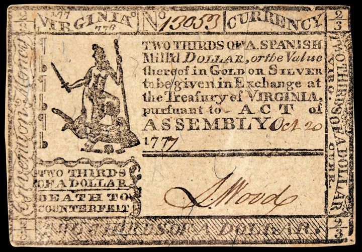 Colonial Currency, VA. October 20, 1777. $2/3. Choice Crisp Uncirculated