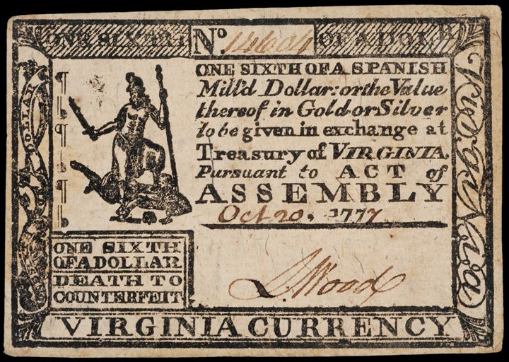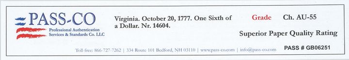 Treasury of Virginia. October 20, 1777, Handwritten Date. One Sixth of a Dollar. PASS-CO graded Choice About Uncirculated-55 Superior Paper Quality Rating.
