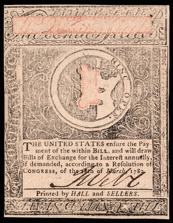 Fr. VA-172. This impressive bright crisp red and black printed Revolutionary War note was printed by Hall & Sellers on specially produced, watermarked “FEDERATION” period laid paper. It is Fully Signed in rich bold brown ink and issued on both its face by John Lyne and Jonathan Boush, and on its back “Guarantee” line by Forster Webb. The edges and corner tips are all extremely sharp, this note has superior overall eye appeal. A 5% annual interest printed payment table is located on the face side at the lower left.