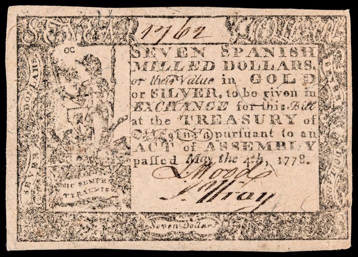 Ex: Ford Choice May 4, 1778 Virginia Seven Dollars Note
