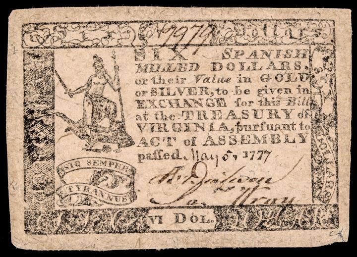 Treasury of Virginia. May 5, 1777. Six Dollars. Choice Extremely Fine.