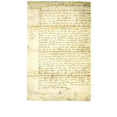 <B>Colonial Document: Regarding Trespassing.</B></I> 7.7" x 12" handwritten, one page document, dated October 2, 1693. The document is written in the specialized phrasing of the legal profession, and with antiquated language. It deals with a case of trespassing and debt between two men. A very interesting look at early colonial legal procedures and language. It the document is in Good condition; slightly soiled on the edges; writing is somewhat faded. From the Henry E. Luhrs Collection.