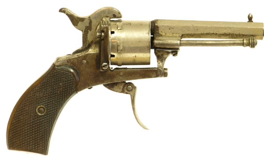 pinfire revolver with 3" octagon barrel and checkered walnut grips. Marked The Colonial Pattern 1886 with good functioning action. NO FFL required.