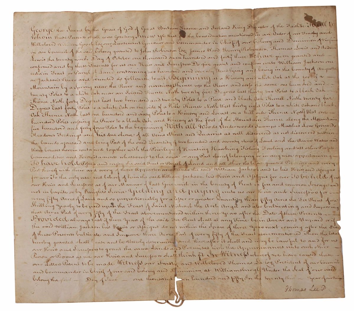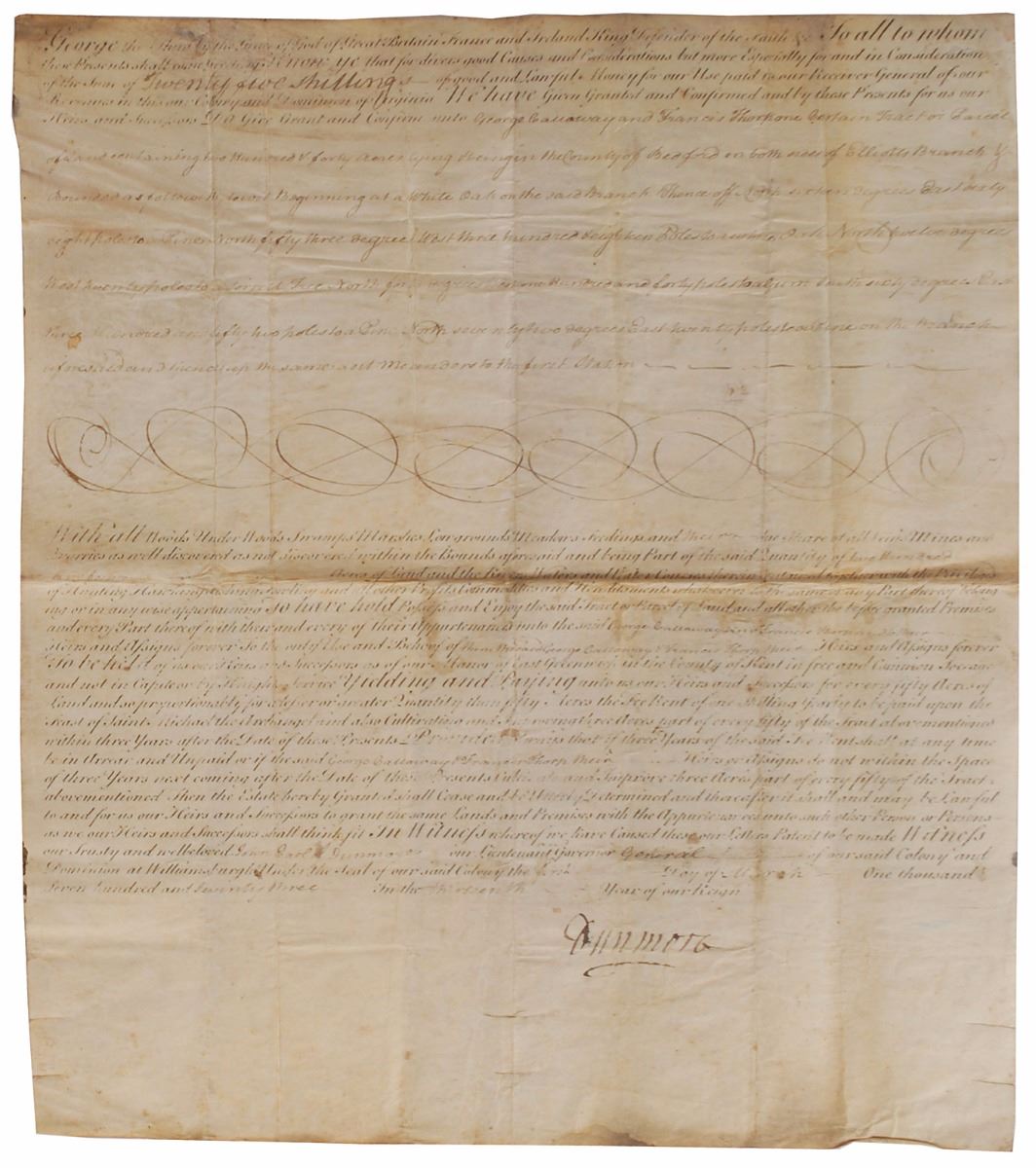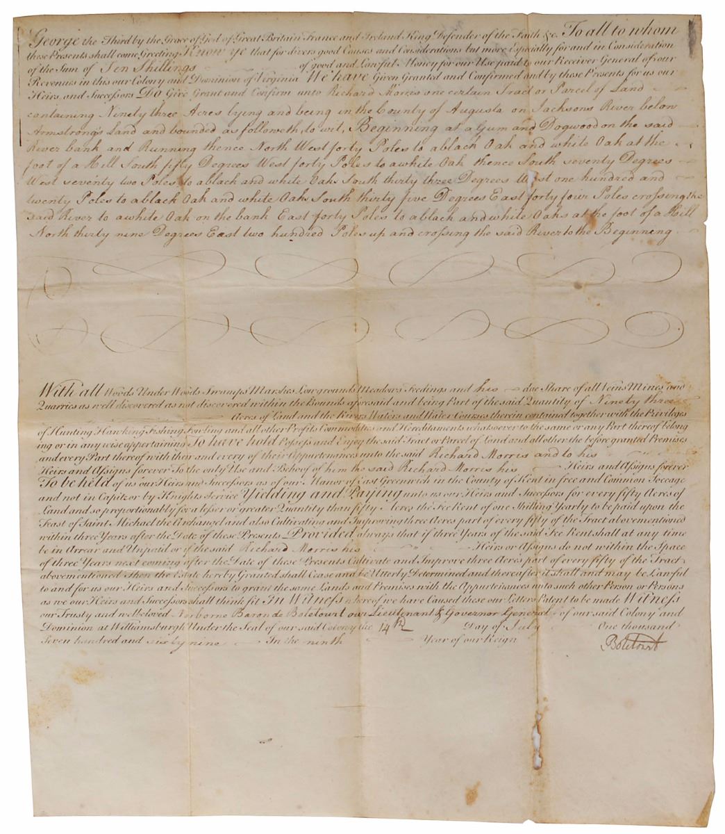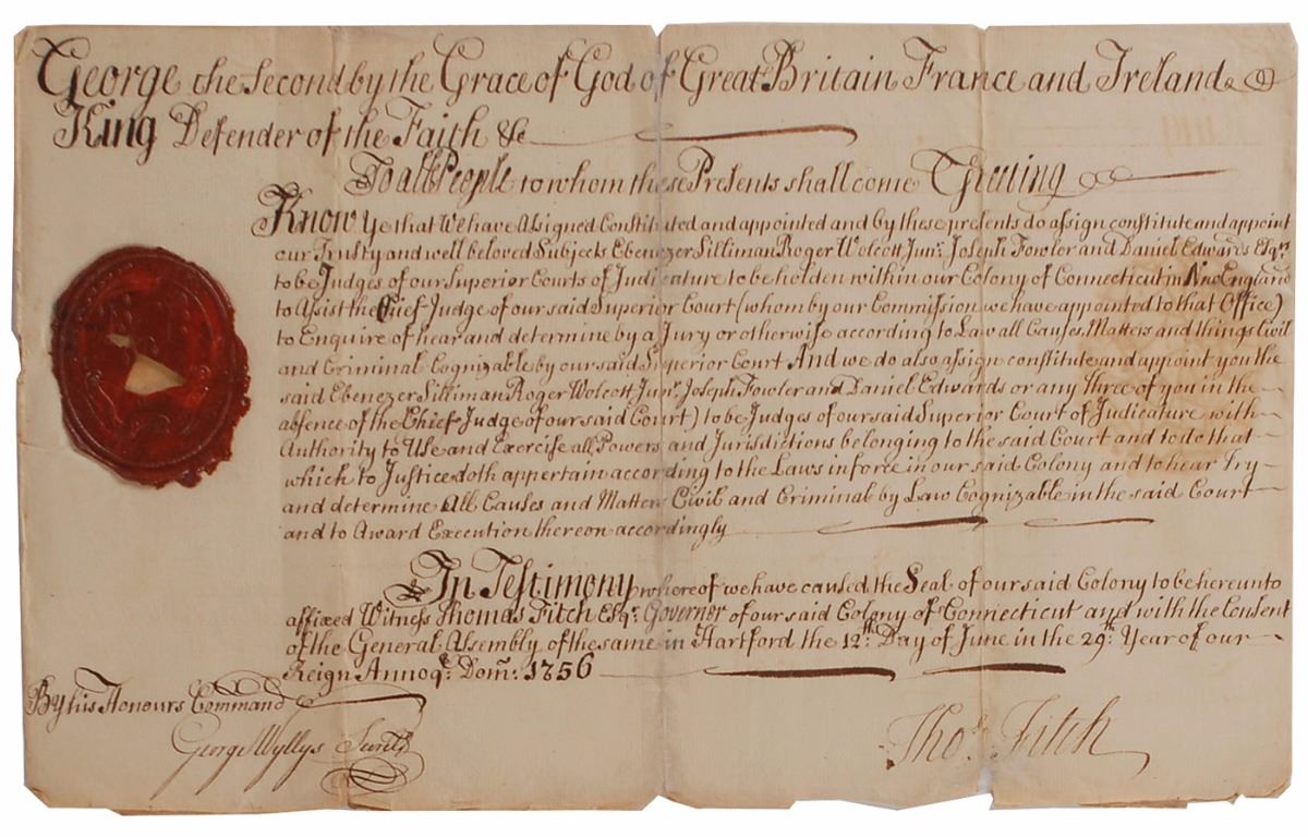 Collection of five documents signed by colonial governors, including: a 1773 partly-printed DS signed by Virginia Governor John Murray, the 4th Earl of Dunmore; a 1769 partly-printed DS signed by Virginia Governor Norborne Berkeley, the 4th Baron Botetourt; a 1750 manuscript DS signed by Virginia Governor Thomas Lee; a 1746 manuscript DS signed by Virginia Governor William Gooch; and a 1756 manuscript DS signed by Connecticut Governor Thomas Fitch. In overall good to very good condition.