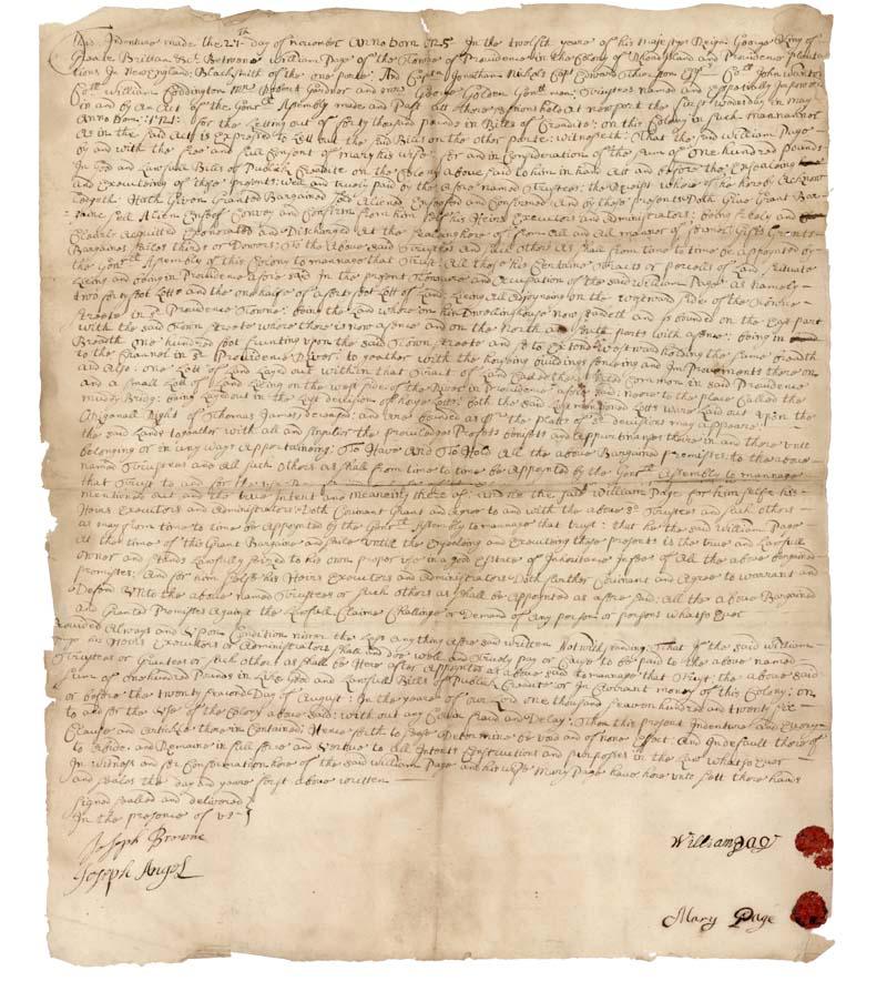 Manuscript Document. One page, 12 3/8” x 14 7/8”. Rhode Island Colony. November 27, 1725. The document serves as an indenture between William Page, blacksmith, on the one part, and Jonathan Nichols, Capt. Edward Thorston [?] … Trustees named and especially empowered … land situate lying and being in Providence aforesaid … of the said William Page as namely two forty foot lott and the one half of a forty foot loot of land lying all adjoining on the westward side of the town street in sd Providence town being the land where on his dwelling house now standeth and is bounded on the east part with the said town street … to extend westward … to the channel in sd. Providence River … the said William Page … well and truly pay or cause to be paid to the above named trustees or grantors … the abovesaid sum of one hundred Pounds in like good and lawful bills of public credit … ” Some minor edge wear. Slight discoloration at borders. Overall Very Fine.