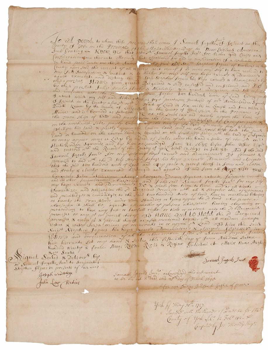Manuscript DS, signed “Dudley Bradstreet Justice of peace” and “Jos. Moody, Reg’r,” one page, 12.75 x 16.5, March 28, 1695. Acknowledgment of an antedated land deed in which Samuel Ingolls, Jr., sold Cocks-Hall, a six-mile by four-mile tract of land in Yorkshire County, Maine, to Serjeant Stephen Jacques. In part (grammar and spelling retained): “To all People to whom these Presents shall come I Samuel Ingolls Junr of Ipswich in the County of Essex in the Province of the Massachusetts Bay…Know ye that the sd Samuel Ingolls Junr for divers good Causes & Considerations me thereunto Moving but especially for & in Consideration of a valuable Sum in Hand paid unto me…by Serjnt Stephen Jacques of Newbury in ye County aforesd the Receipt of all & every part thereof I do own my self to have received to my full satisfaction &…do thereby for my self…acquitt exonerate & discharg the sd Serjnt Stephen Jaques his heyrs Execrs and Administs by these Present Have given granted bargained & sold enscoffed and confirmed…two hundred Acres of Land being part of a Tract which my self and divers others as joynt Purchasers purchased of Mr Harlackenden Symonds of Ipswich in the County aforesd which sd Tract of Land is six Miles in length & four Miles in Breadth known by the Name of Cocks Hall in the County of Yorkshire in the Province of Maine.” Signed at the conclusion by Bradstreet as the justice of the peace, and by Joseph Moody as the registrar. In good condition, with staining, small areas of paper loss, and professional reinforcements along partially separated intersecting folds. The son of the accomplished New World poet Anne Bradstreet, Dudley Bradstreet was an attorney and town clerk in the town of Andover, Massachusetts, who found himself in the unenviable position of Justice of the Peace during the witchcraft hysteria. During an eight-week period in 1692, Bradstreet committed some thirty people to prison for supposed witchcraft. When Bradstreet refused to grant warrants for a group of eighteen ‘afflicted’ women just a day later, both he and his wife were accused of witchcraft and were forced to flee the town for a brief time. This document is also noteworthy for the presence of Moody, a minister of the Second Church of York, whose character served as the basis for the veiled Puritan minister in Nathaniel Hawthorne’s short story The Minister’s Black Veil.