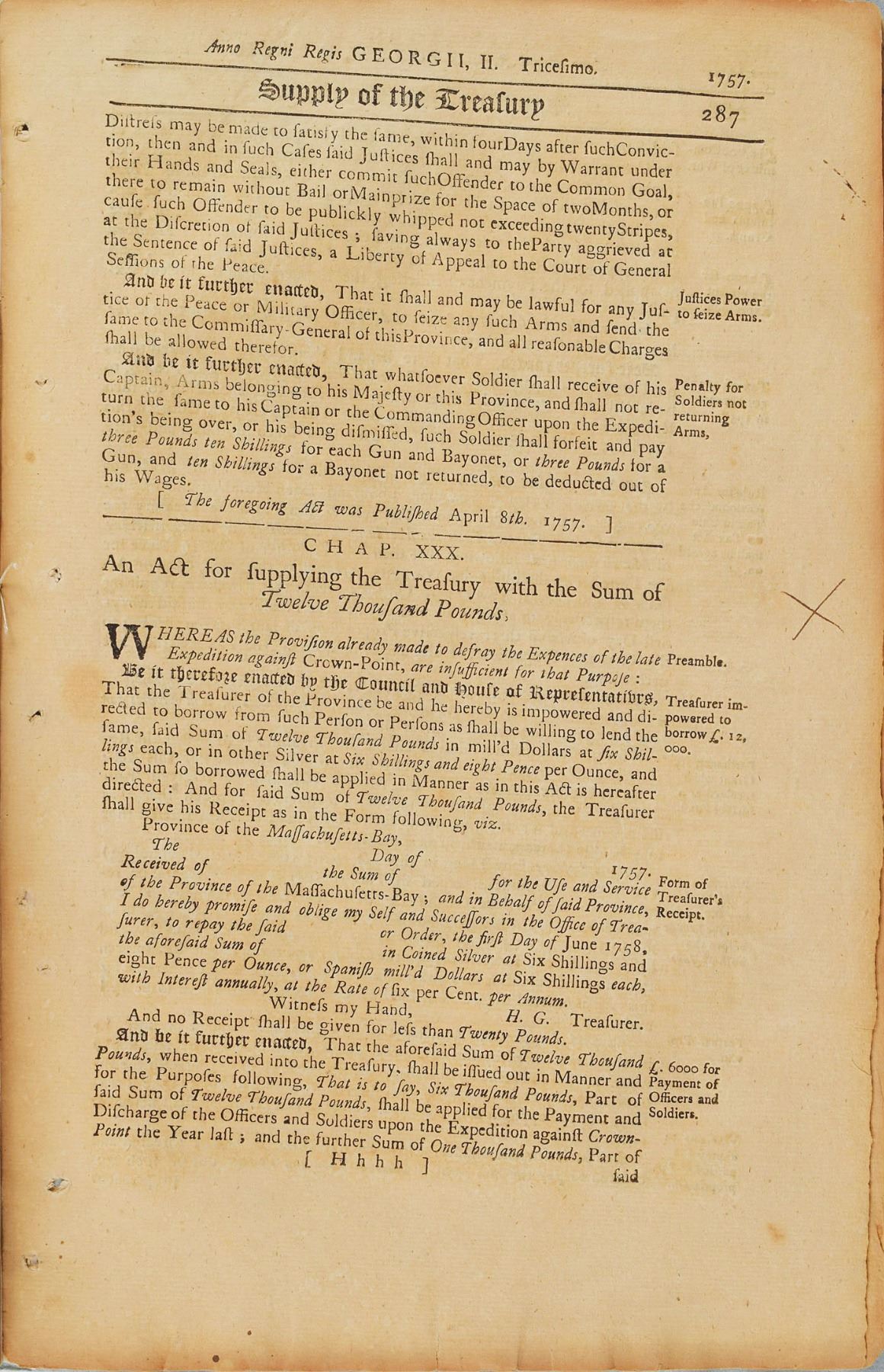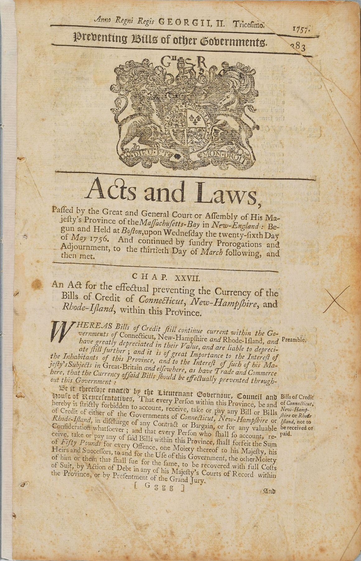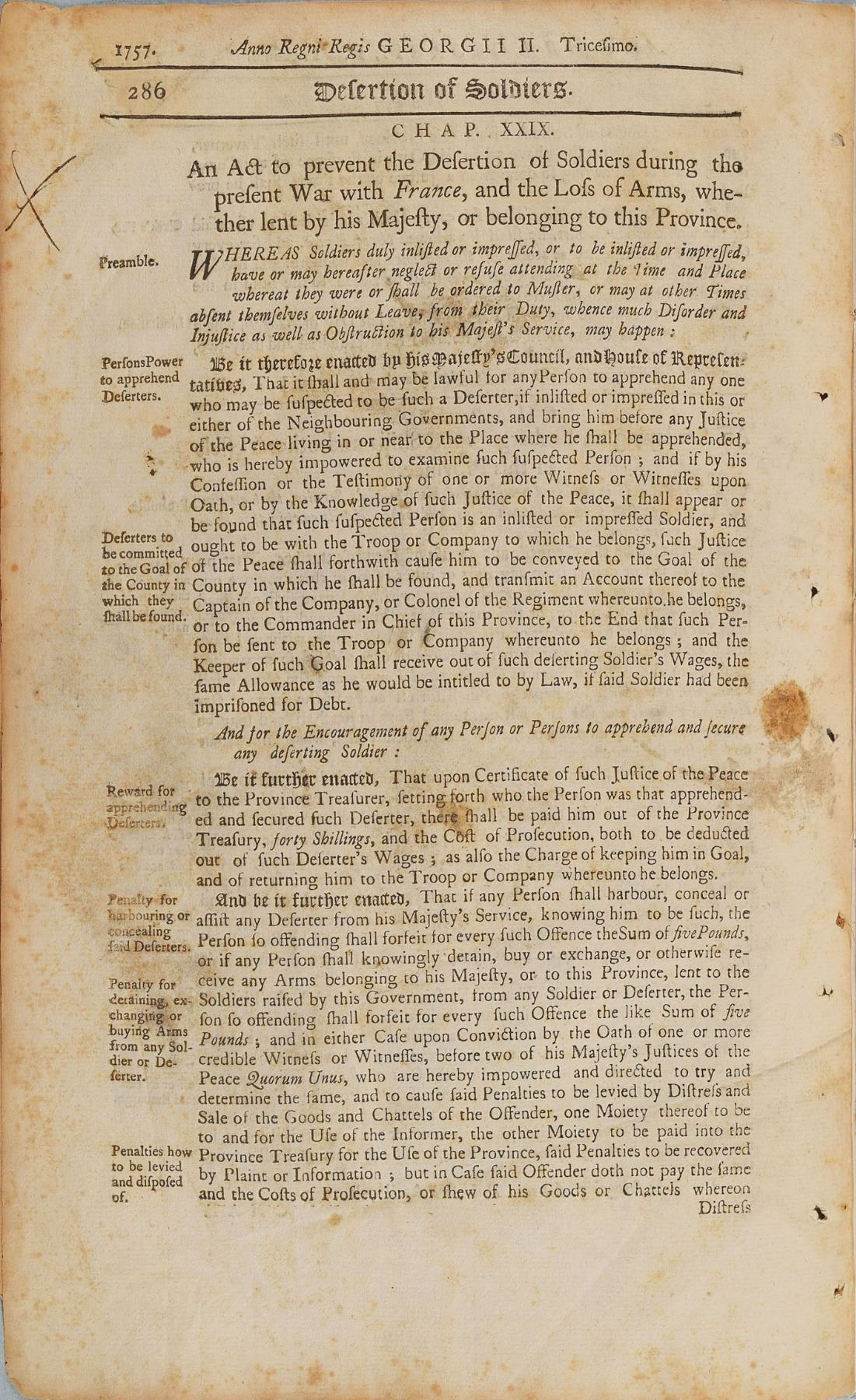 Rare 1757 booklet of "Acts and Laws Passed by the Great and General Court or Assembly of His Majesty's Province of the Massachusetts–Bay," ten total pages, 7.75 x 11.75, consisting of pages 283–292, the sessions were "Begun and Held at Boston, upon Wednesday the twenty-sixth Day of May 1756. And continued by sundry Prorogations and Adjournment, to the thirtieth Day of March Following, and then met." Articles listed within are as such: "Chap. XXVII. An Act for the effectual preventing the Currency of the Bills of Credit of Connecticut, New–Hampshire, and Rhode–Island, within this Province"; "Chap. XXIX [XXVIII]. An Act laying an Embargo upon Ships and other Vessels in this Province"; "Chap. XXIX. An Act to prevent the Desertion of Soldiers during the present War with France, and the Loss of Arms, whether lent by his Majesty, or belonging to this Province"; "Chap. XXX. An Act for supplying the Treasury with the Sum of Twelve Thousand Pounds"; "Chap. XXXI. An Act appointing the Times for holding the Superior Courts of Judicature &c. in the Counties of Plymouth and Barnstable for the present Year"; "Chap. XXXII. An Act for the Encouragement of Seamen to enlist themselves in such Vessels of War as are or shall be Commissioned and fitted out by the Government during the present war with France"; "Chap. XXXIII. An Act for Enquiring into the Rateable Estates of the Province"; and "Chap. XXXIV. An Act for raising a Sum of Money by Lottery for the Encouragement of the Settlement called Germantown in the Town of Braintree." Bound into a presentation folder. In very good condition, with scattered foxing and toning.