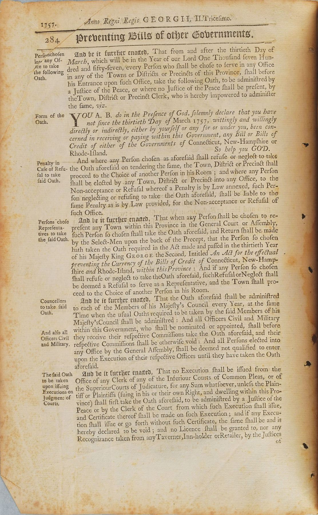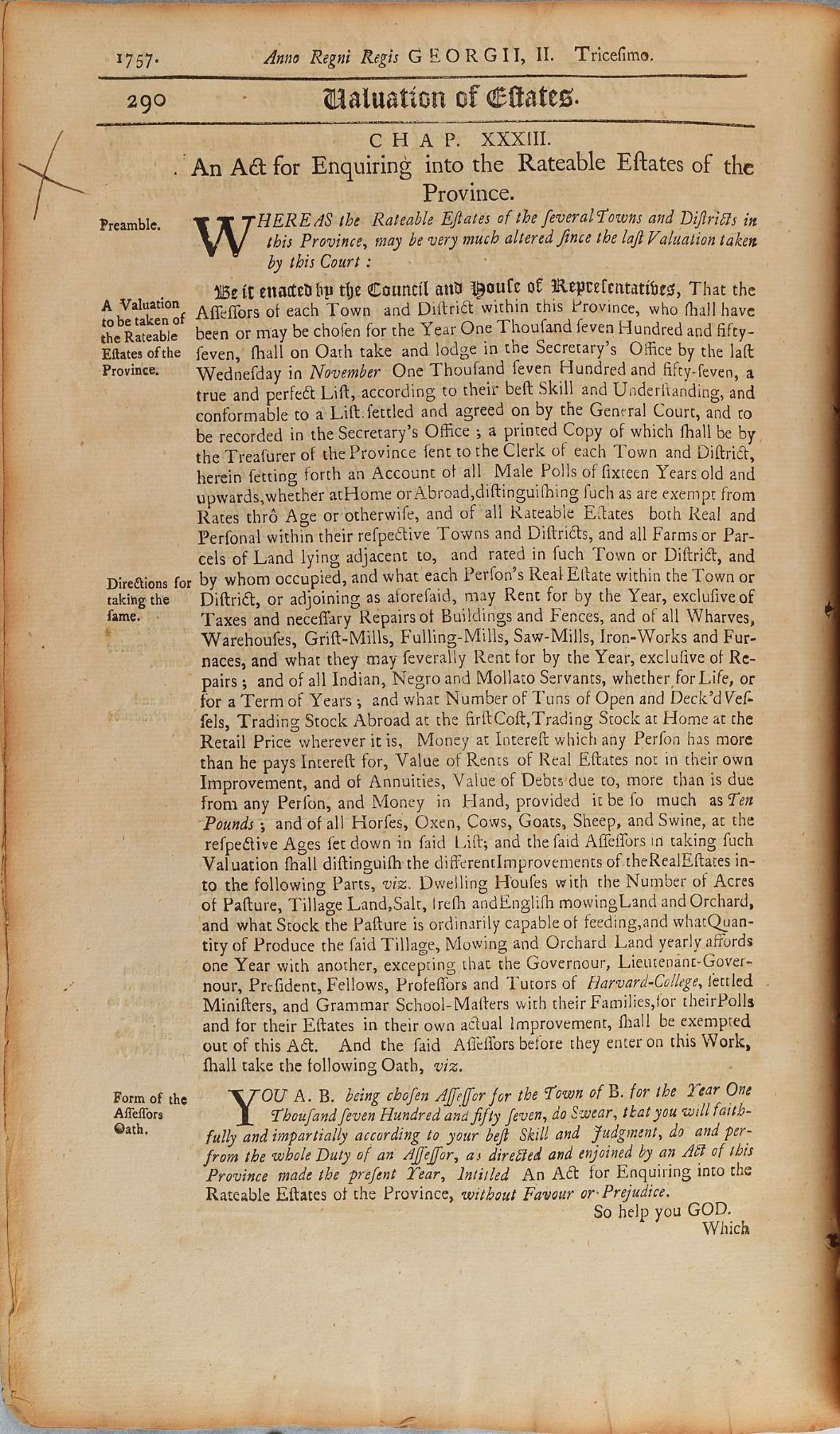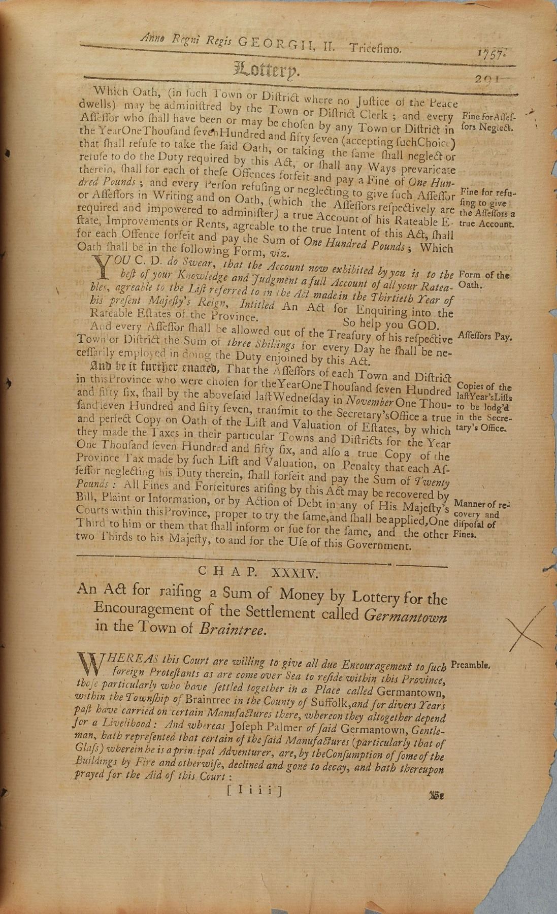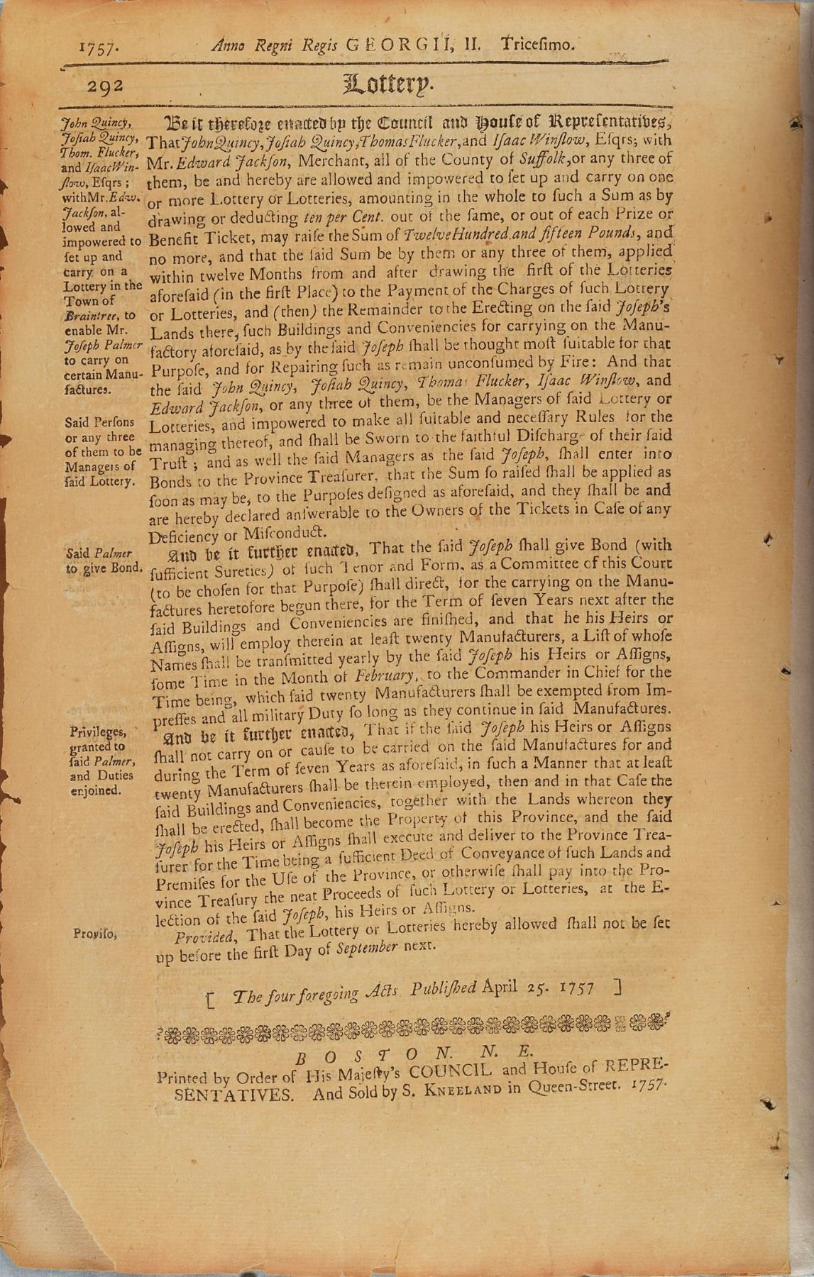 Rare 1757 booklet of "Acts and Laws Passed by the Great and General Court or Assembly of His Majesty's Province of the Massachusetts–Bay," ten total pages, 7.75 x 11.75, consisting of pages 283–292, the sessions were "Begun and Held at Boston, upon Wednesday the twenty-sixth Day of May 1756. And continued by sundry Prorogations and Adjournment, to the thirtieth Day of March Following, and then met." Articles listed within are as such: "Chap. XXVII. An Act for the effectual preventing the Currency of the Bills of Credit of Connecticut, New–Hampshire, and Rhode–Island, within this Province"; "Chap. XXIX [XXVIII]. An Act laying an Embargo upon Ships and other Vessels in this Province"; "Chap. XXIX. An Act to prevent the Desertion of Soldiers during the present War with France, and the Loss of Arms, whether lent by his Majesty, or belonging to this Province"; "Chap. XXX. An Act for supplying the Treasury with the Sum of Twelve Thousand Pounds"; "Chap. XXXI. An Act appointing the Times for holding the Superior Courts of Judicature &c. in the Counties of Plymouth and Barnstable for the present Year"; "Chap. XXXII. An Act for the Encouragement of Seamen to enlist themselves in such Vessels of War as are or shall be Commissioned and fitted out by the Government during the present war with France"; "Chap. XXXIII. An Act for Enquiring into the Rateable Estates of the Province"; and "Chap. XXXIV. An Act for raising a Sum of Money by Lottery for the Encouragement of the Settlement called Germantown in the Town of Braintree." Bound into a presentation folder. In very good condition, with scattered foxing and toning.