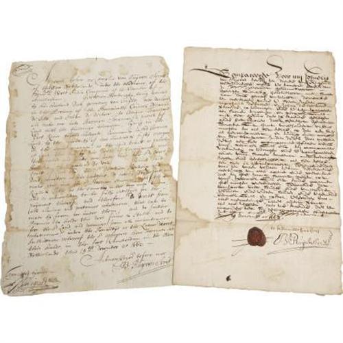 <B>Colonial New York Document Signed in Dutch Regarding the Bronx.</B></I> One page, 8" x 12", one leaf of bifolia, Fort Amsterdam, December 19, 1662, ink. Accompanied by an English translation contemporary with the original document. Extremely rare 1662 Dutch document, transferring land ownership of a chunk of the Bronx. Document signed by Cornelis Van Ruyven as Secretary of the New Netherlands under the Honorable West India Company, in Dutch. An indenture conveying land in the Bronx from Gertrude Hendricks to Harman Smeeman. The translation reads, in part: "<I>...a parcel of land with the building thereupon, lying in the East River beyond Hellegate, commonly called Bronex Land...</B></I>". Notarized in wax next to the signature. Very good condition, with toning, edge wear, and mild damp-staining present.<BR><BR><b>Shipping:</b> Flat Material, Small (<a target="_blank" href="http://www.heritageauctions.com/common/shipping.php">view shipping information</a>)