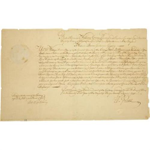 <B>[Colonial Americana] William Greene Manuscript Document Signed</B></I> "<I>W. Greene</B></I>". One page, 12.5" x 7.5", Colony of Rhode Island, May 10, 1748. A military commission appointing William Brown a "<I>...lieutenant colonel of the Regiment of Militia in the County of Providence and Town of Warren in this Colony...</B></I>", obliging him "<I>...in the Case of any Invasion or Assault of a Common Enemy to Infest and Disturb these his Majesty's Plantations" to 'Alarm and Gather together the Regiment under your Command.'...</B></I>" Countersigned by Thomas Ward as secretary of state. William Greene served four intermittent terms as colonial governor of Rhode Island between 1743 and 1758. His son, of the same name, would serve as the second governor of the state of Rhode Island. The document is in fine condition with some light stains and old paper reinforcements on verso. Paper seal is intact.<BR><BR><b>Shipping:</b> Flat Material, Small (<a target="_blank" href="http://www.heritageauctions.com/common/shipping.php">view shipping information</a>)