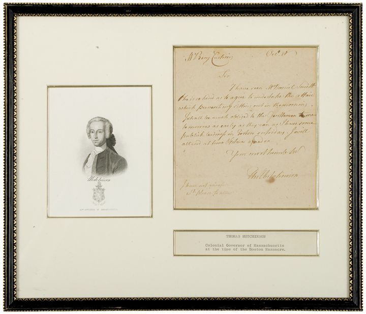 A rare, Manuscript Autograph Letter Signed, “Tho Hutchinson,” one page, 6” x 7” (sight), no place, October 20, no year, Very Fine. To “Mr. Benjamin Cushing” regarding a possible meeting. It is most elegantly displayed in 15.5” x 13” ornate wooden frame, with an nice inset portrait of Hutchinson, and short typed biographical summary at the lower right. Small light tone spot at bottom edge of signature and one very minor instance of ink blotting within text. It reads, in full: