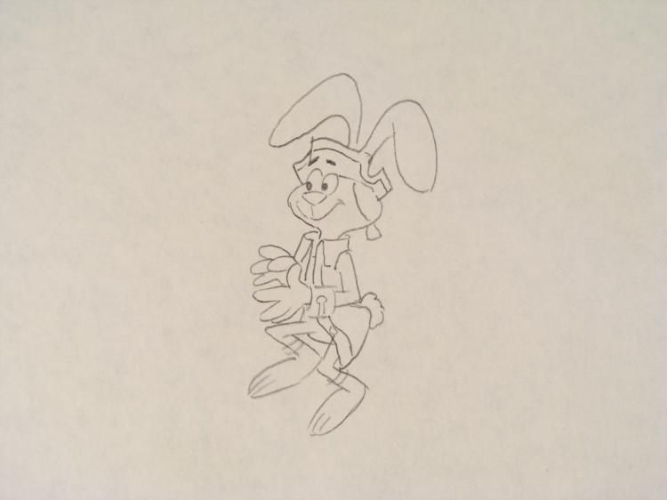 The Trix rabbit is in a colonial outfit Original Animation DrawingDetails: Animation notations and peg holes Original "rough" animation drawing in black pencil Size of drawing: 10 1/2 x 12 1/2 inches Condition: Very good Traditional animation is a multi-step process which includes various types of art techniques. Drawings are a key part of the process, in which the animator creates the design and movement of the characters. Drawings are then transferred onto acetate cels (by hand-inking and/or photo copying) to create a production cel, which is then hand painted on the back side, using paint colors chosen and approved by the creator of the series.