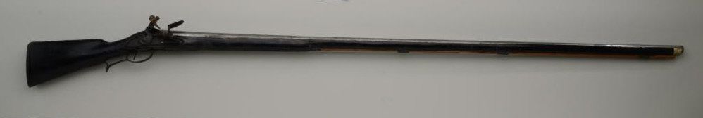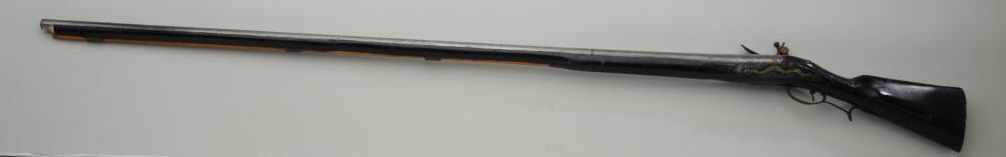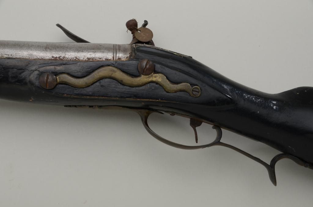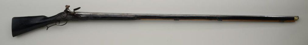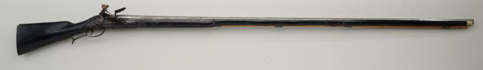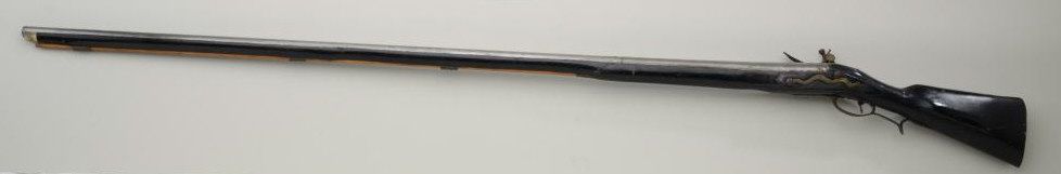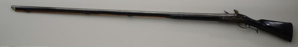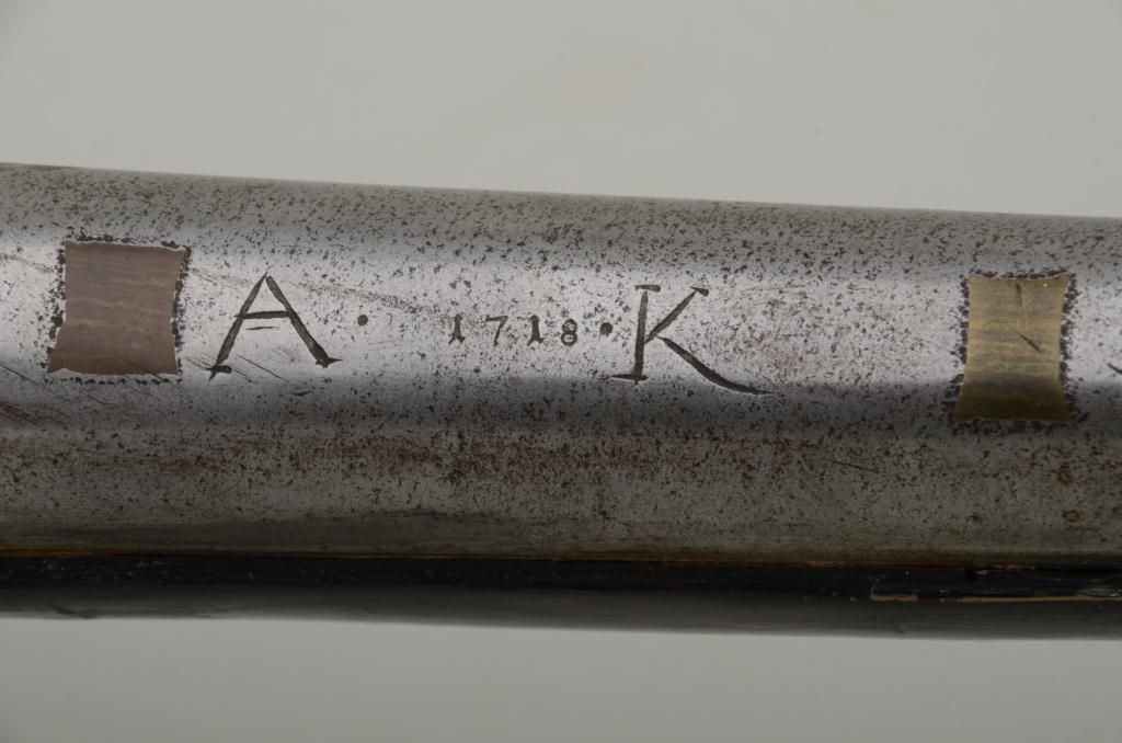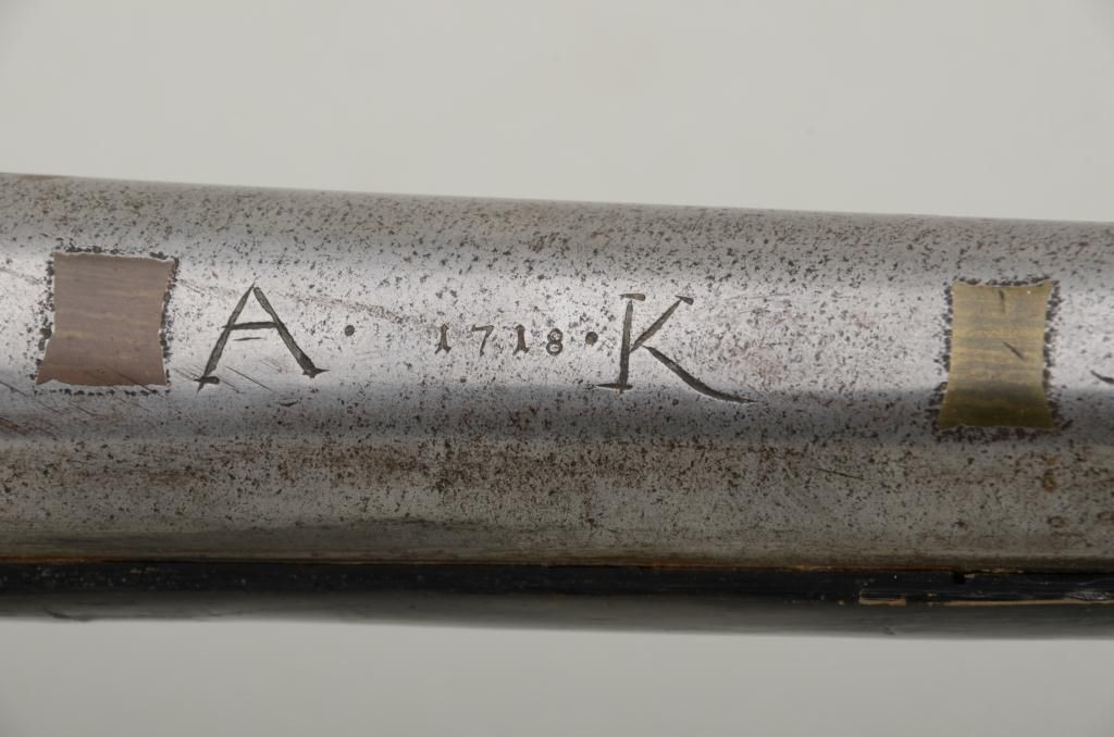 Colonial era flintlock fowler showing strong Germanic influence and styling signed A.K. and dated 1718 on the barrel. The gun measures 77 ½” overall with 61 ½” round barrel of approximately .80 calibersmoothbore. The lock is in its original flintlock configuration showing a dark brown patina with original hammer, frizzen, top jaw , screws and small parts. There is a collection tag numbered 1402 wired to thescrew. The barrel shows two brass inlays where there had been a sight on the barrel which was moved back or taken off. The side plate shows a serpentine influenced shape and the trigger guard shows simple treetop style finial. The butt plate is thin brass nailed on. The butt measures 2 ¾” in width with thick and heavy Germanic style. The stock has had extensive restoration and has been darkened to black finish at the point ofrestoration to mask the repairs which were done long ago. The forend cap is an old incorrect replacement using cow bone. The ramrod thimbles and mounts show a dark patina. This Fowler may well have been